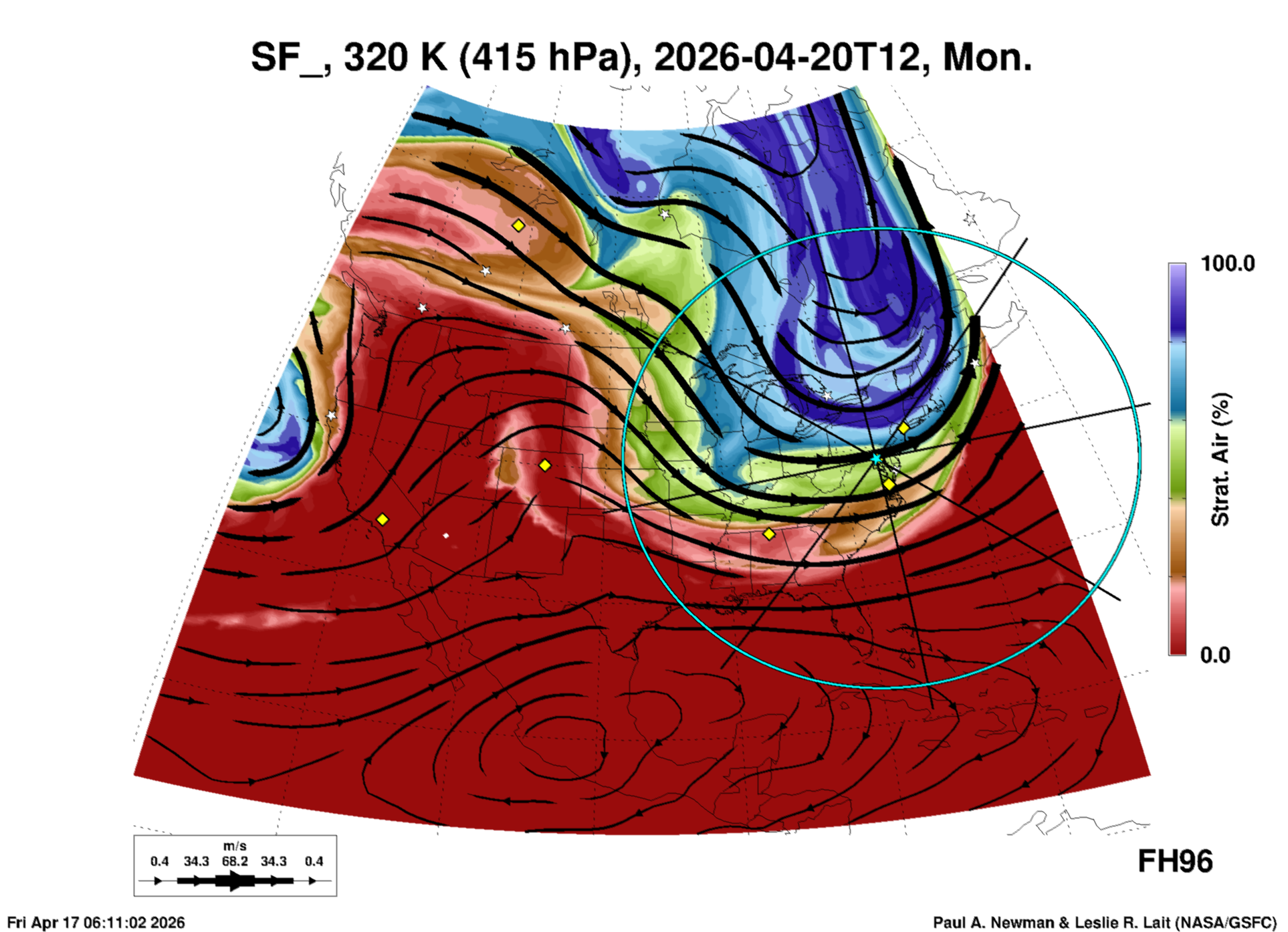 Most of these plots show a color-coded image background of some physical quantity which is labelled in the leftmost column above. A color bar scale on the right of the image shows how the quantity values map to the colors. Superimposed on the image is a depiction of the horizontal flow field as blue streamlines with arrows marking the direction of the flow. The thickness of each streamline indicates the wind speed, according to the legend at the bottow left. Where the physical quantity is a vertically cumulative variable that does not describe a single vertical level (e.g. CAPE), the pressure level indicated in the title is that of the flow field. Continental outlines are shown as thin white or yellow lines.
