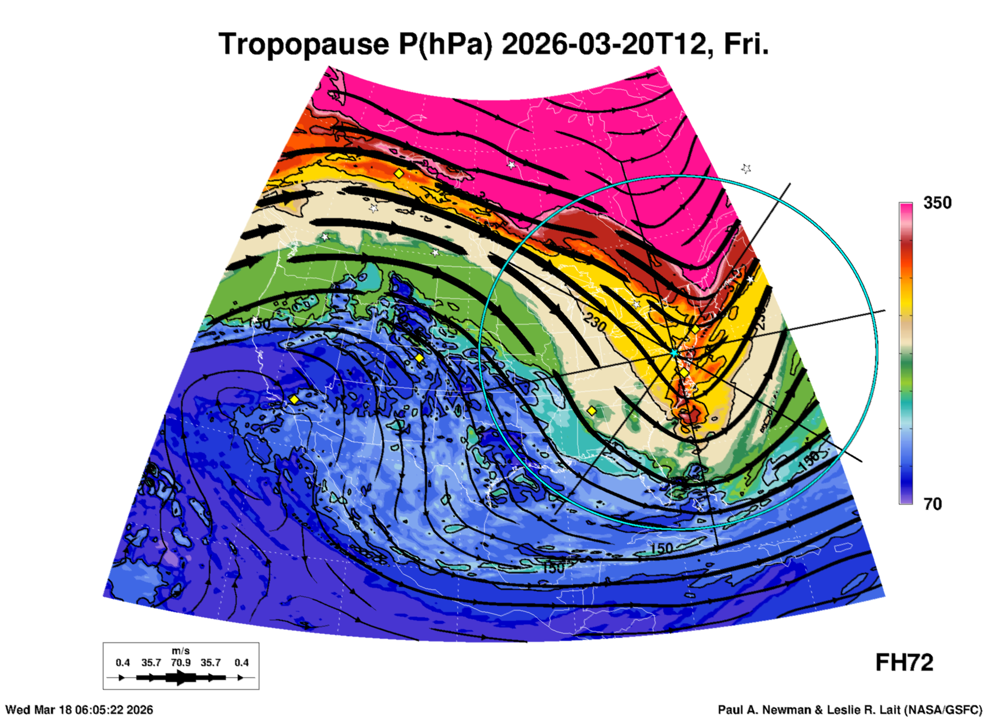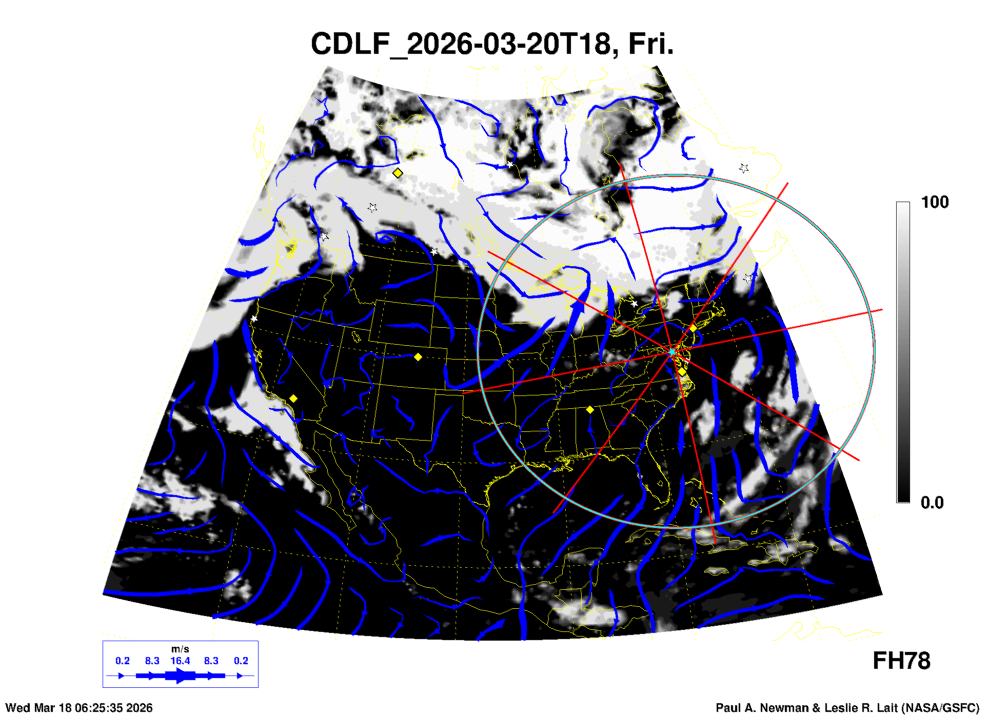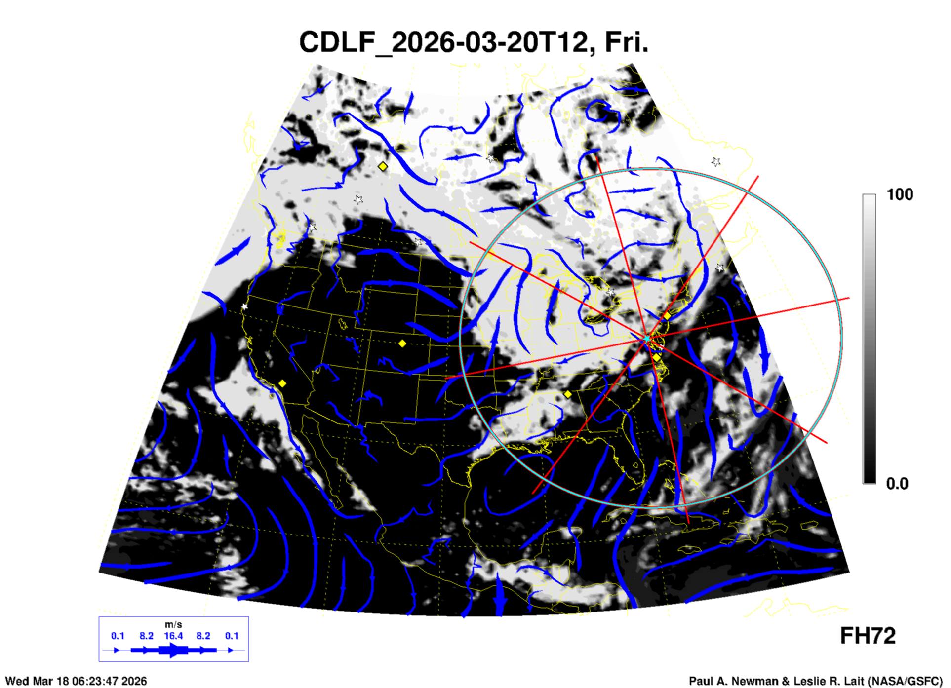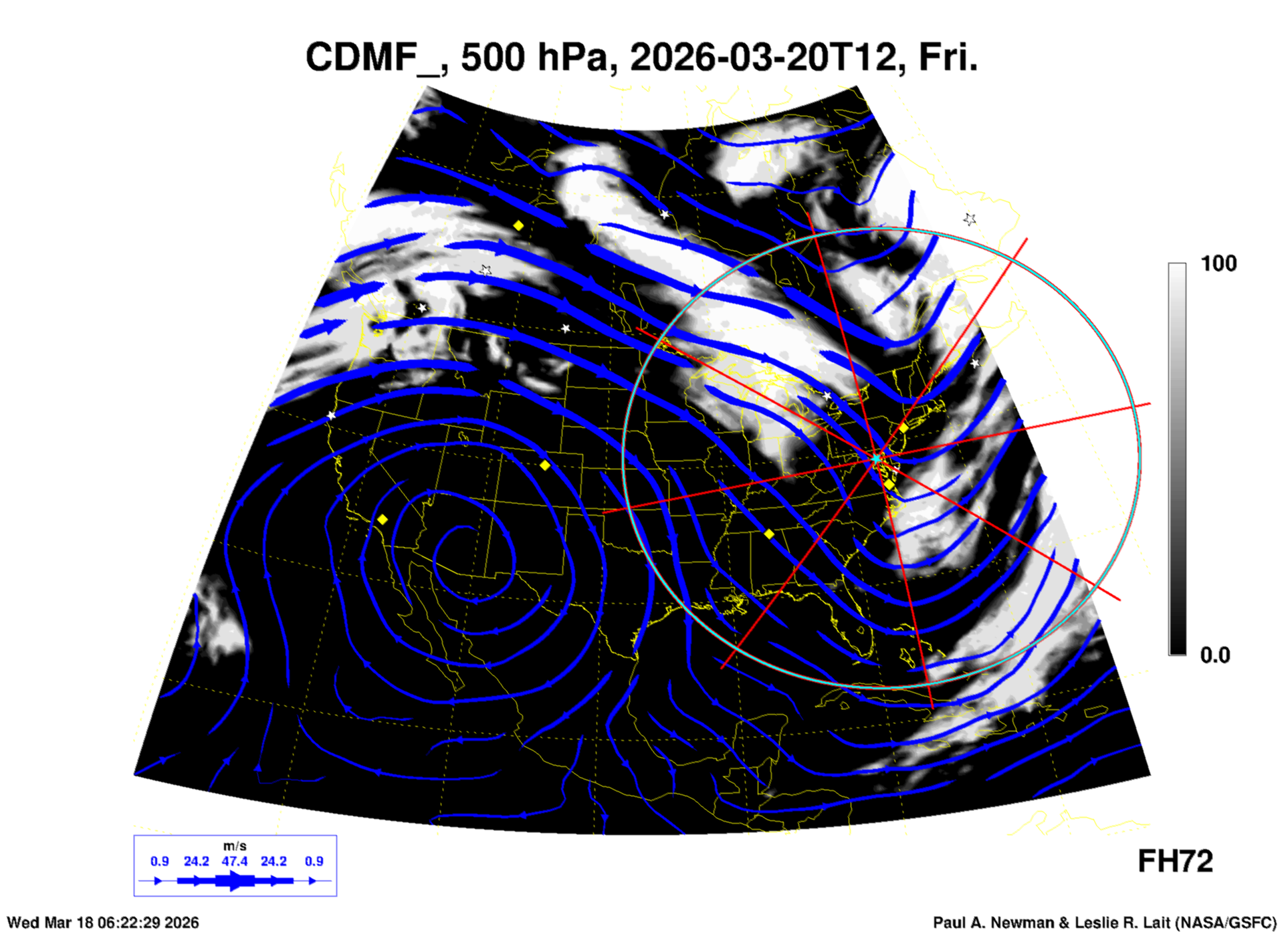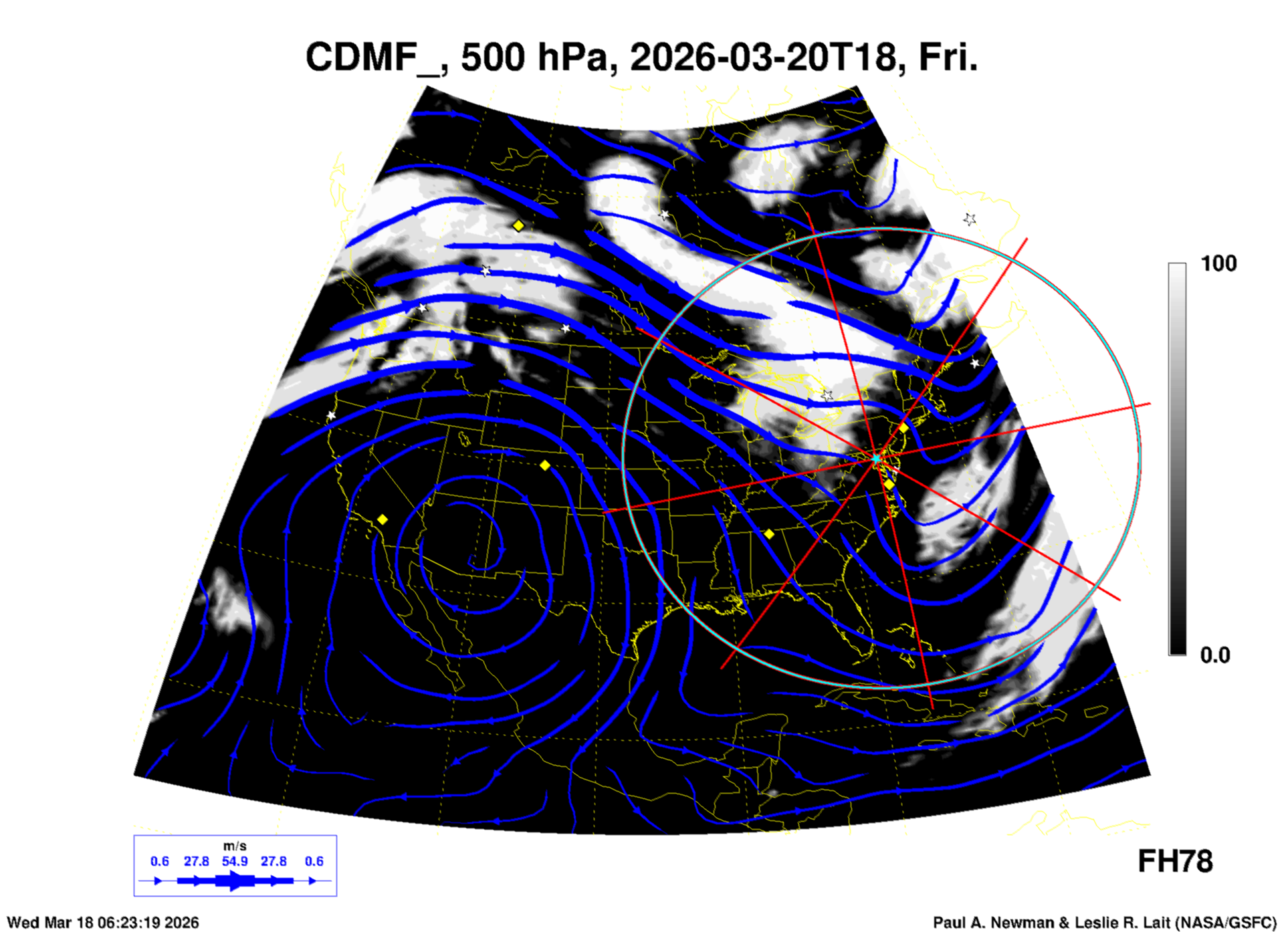 Most of these plots show a color-coded image background of some physical quantity which is labelled in the leftmost column above. A color bar scale on the right of the image shows how the quantity values map to the colors. Superimposed on the image is a depiction of the horizontal flow field as blue streamlines with arrows marking the direction of the flow. The thickness of each streamline indicates the wind speed, according to the legend at the bottow left. Where the physical quantity is a vertically cumulative variable that does not describe a single vertical level (e.g. CAPE), the pressure level indicated in the title is that of the flow field. Continental outlines are shown as thin white or yellow lines.