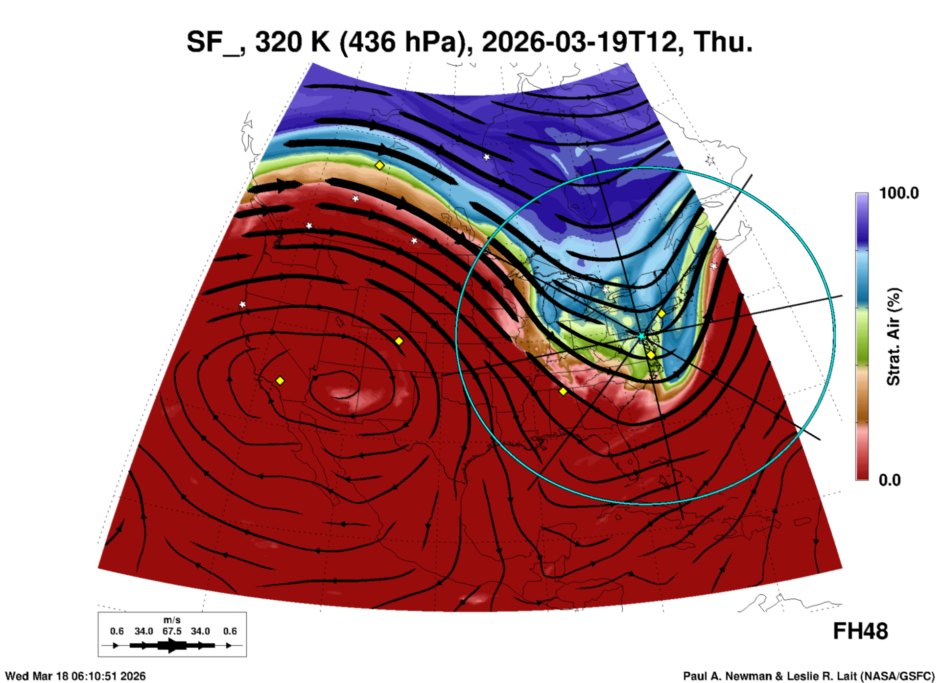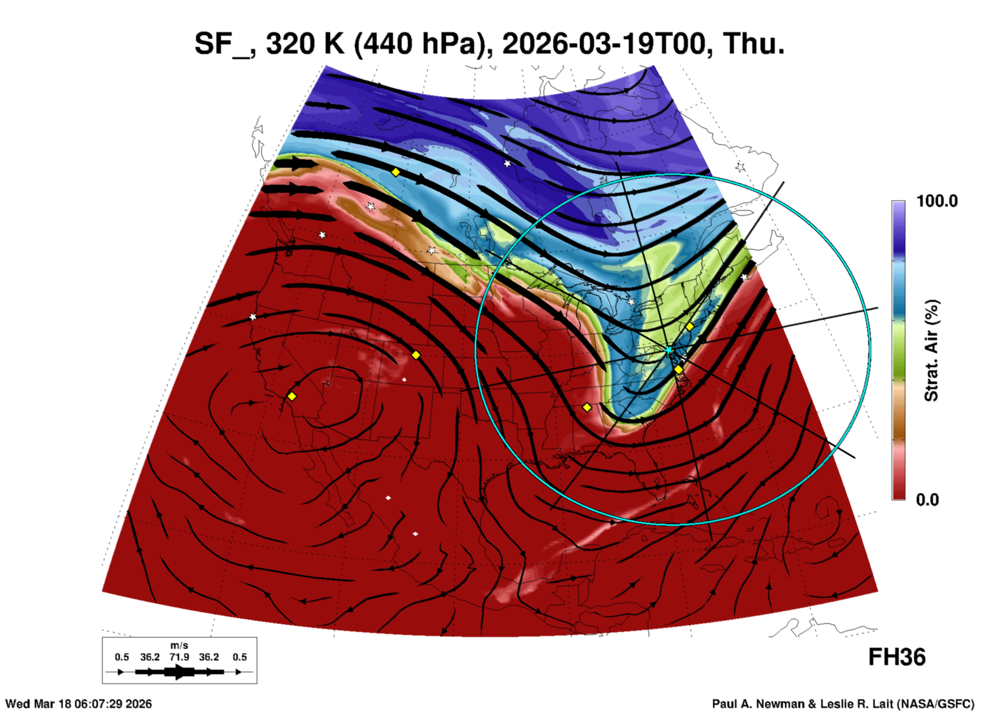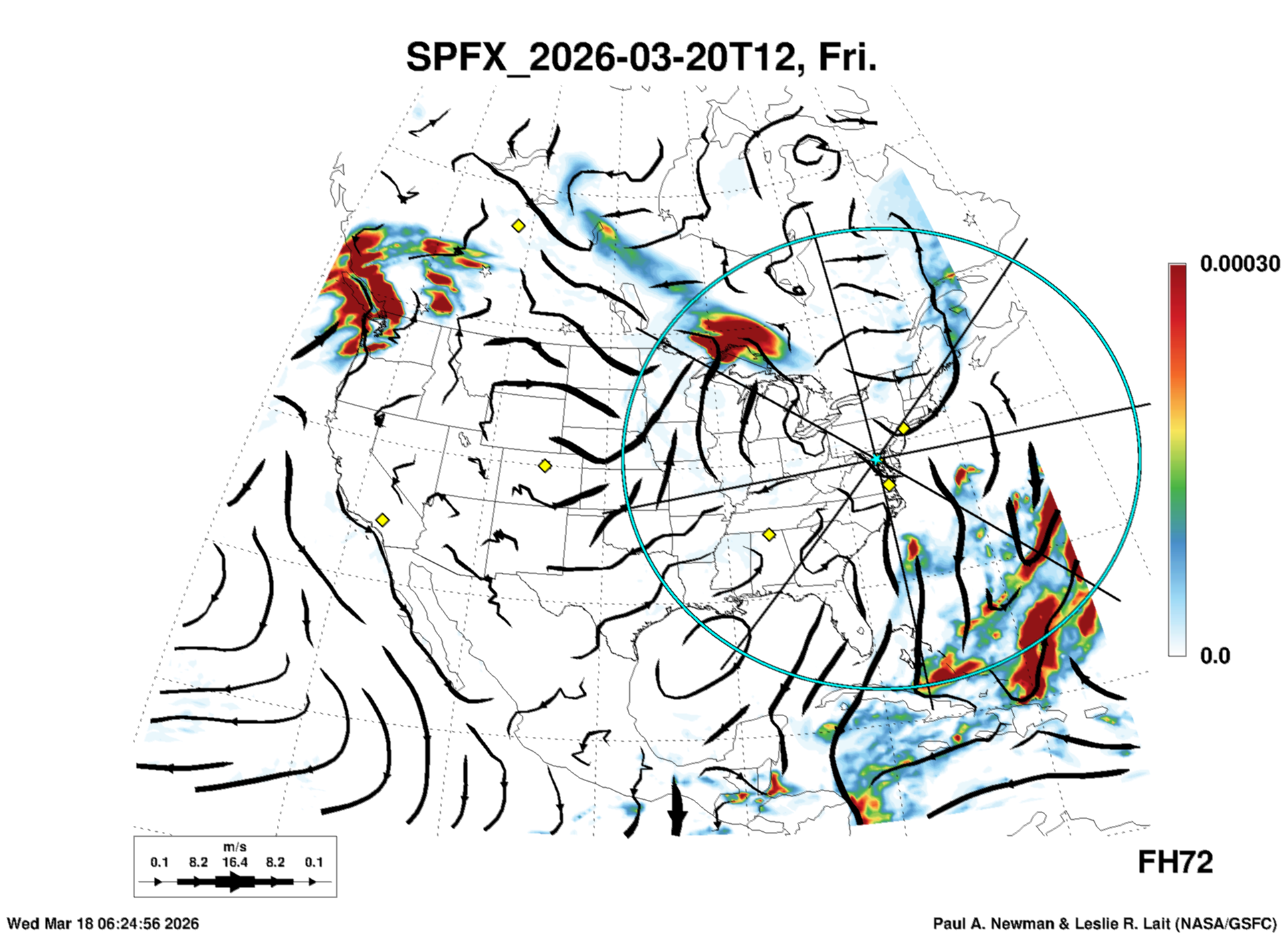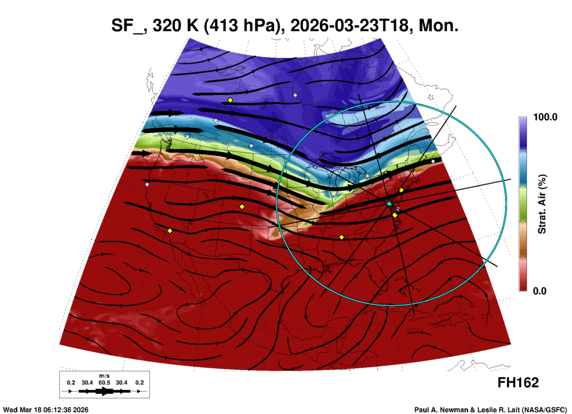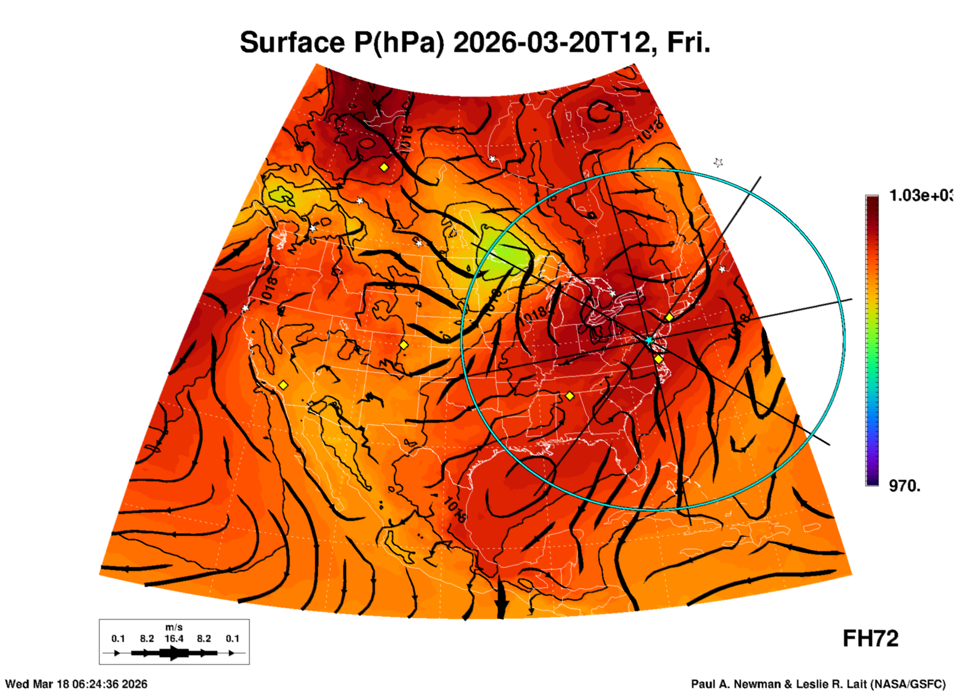 Most of these plots show a color-coded image background of some physical quantity which is labelled in the leftmost column above. A color bar scale on the right of the image shows how the quantity values map to the colors. Superimposed on the image is a depiction of the horizontal flow field as blue streamlines with arrows marking the direction of the flow. The thickness of each streamline indicates the wind speed, according to the legend at the bottow left. Where the physical quantity is a vertically cumulative variable that does not describe a single vertical level (e.g. CAPE), the pressure level indicated in the title is that of the flow field. Continental outlines are shown as thin white or yellow lines.