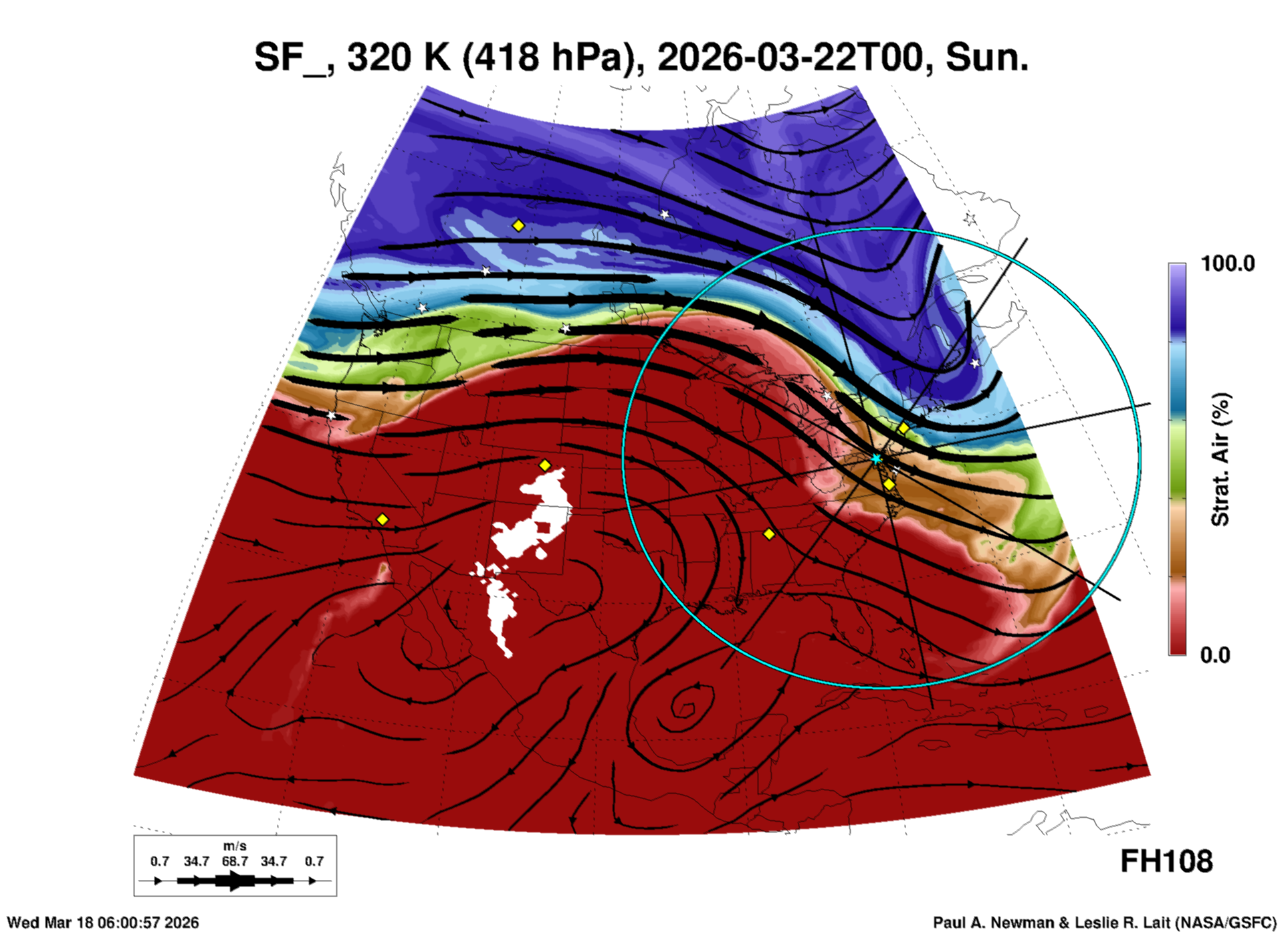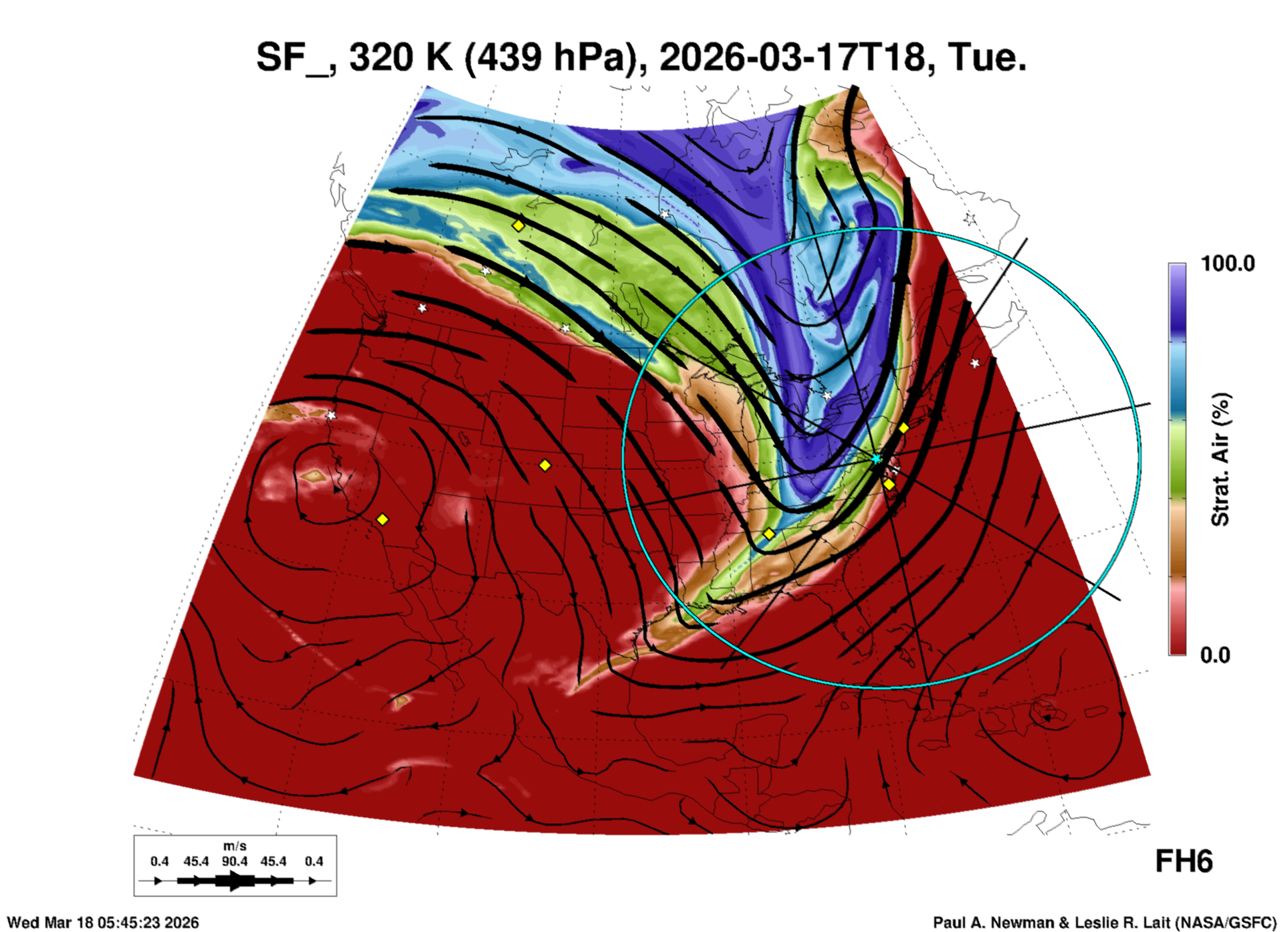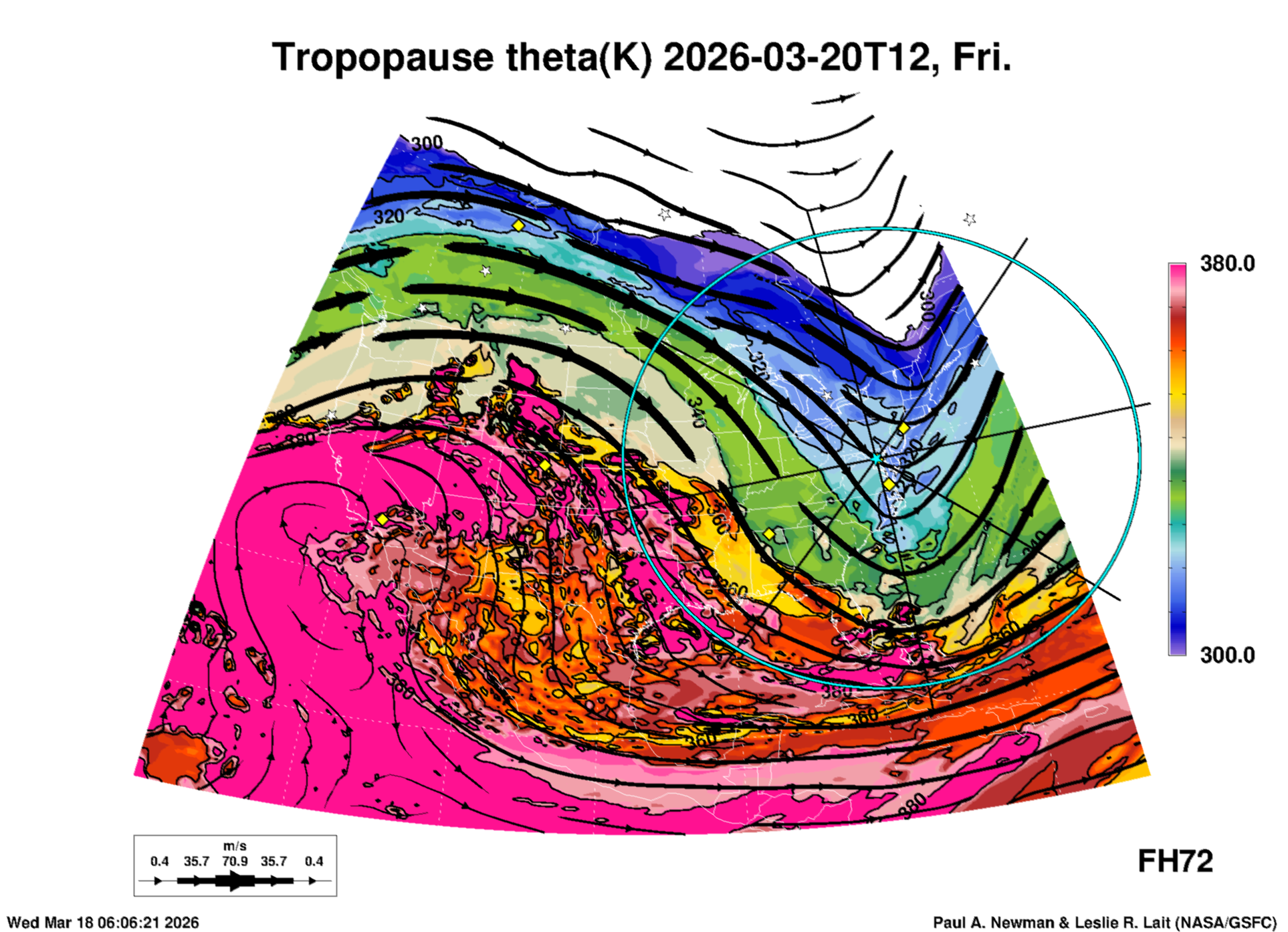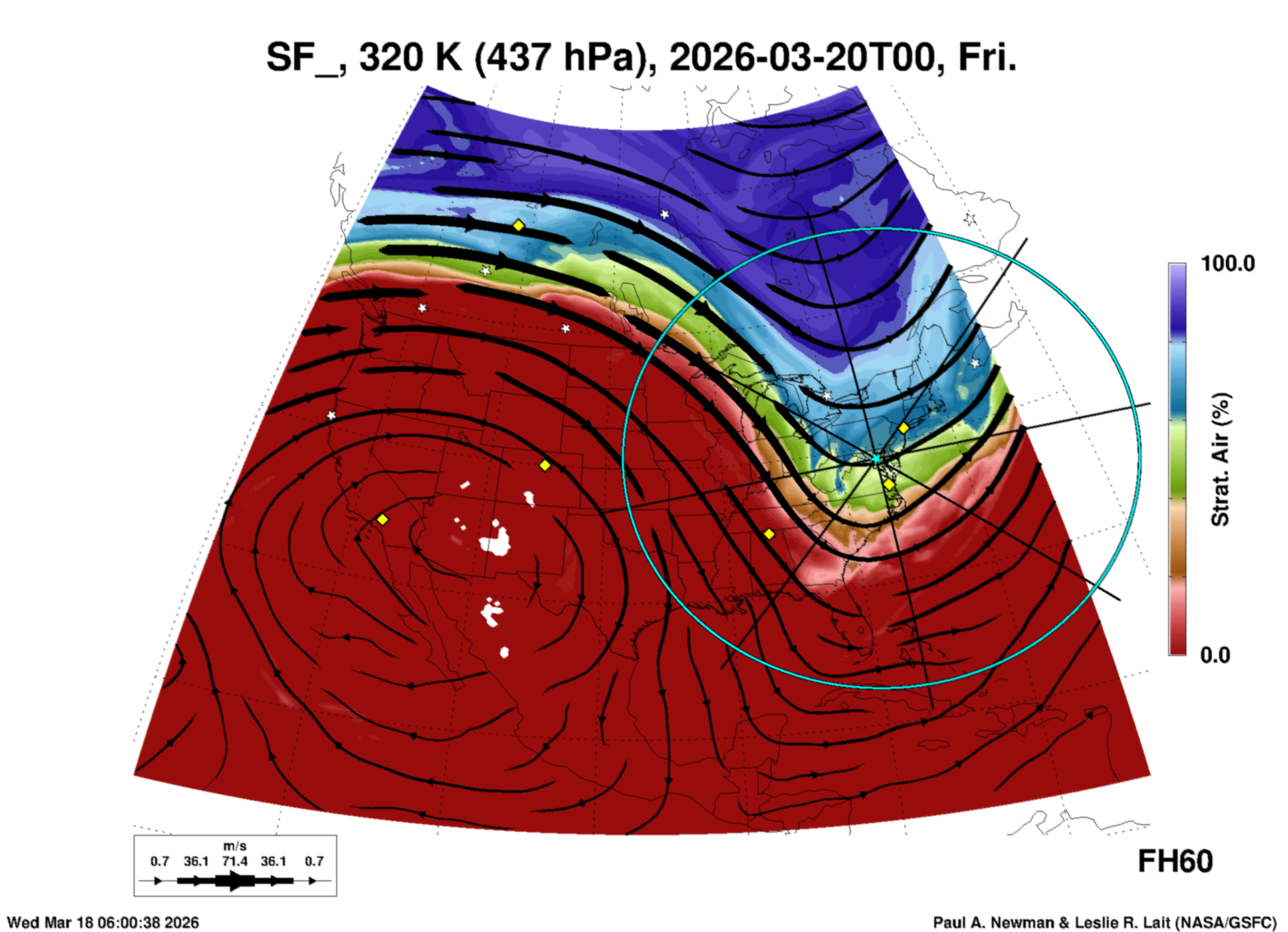 Most of these plots show a color-coded image background of some physical quantity which is labelled in the leftmost column above. A color bar scale on the right of the image shows how the quantity values map to the colors. Superimposed on the image is a depiction of the horizontal flow field as blue streamlines with arrows marking the direction of the flow. The thickness of each streamline indicates the wind speed, according to the legend at the bottow left. Where the physical quantity is a vertically cumulative variable that does not describe a single vertical level (e.g. CAPE), the pressure level indicated in the title is that of the flow field. Continental outlines are shown as thin white or yellow lines.