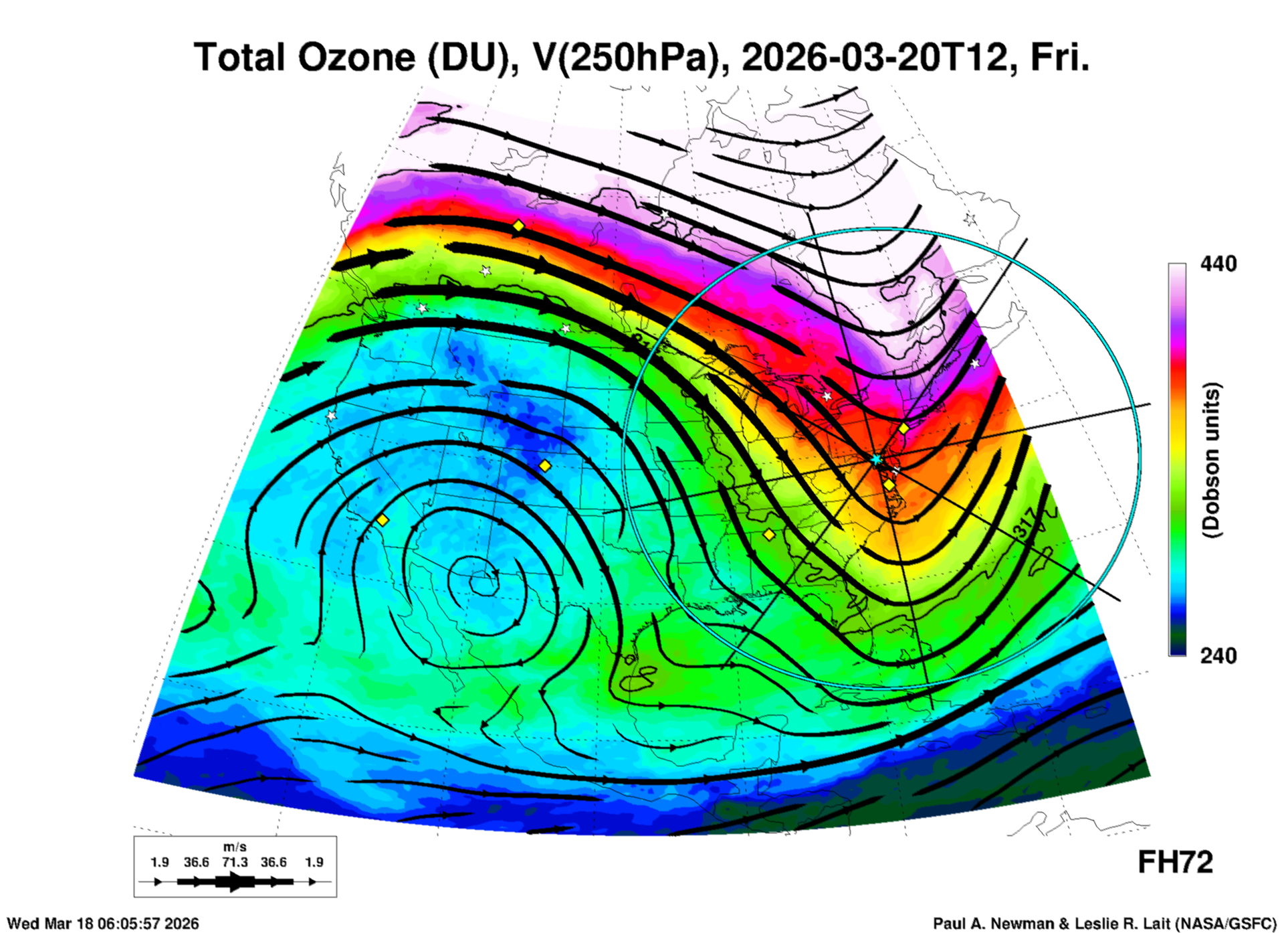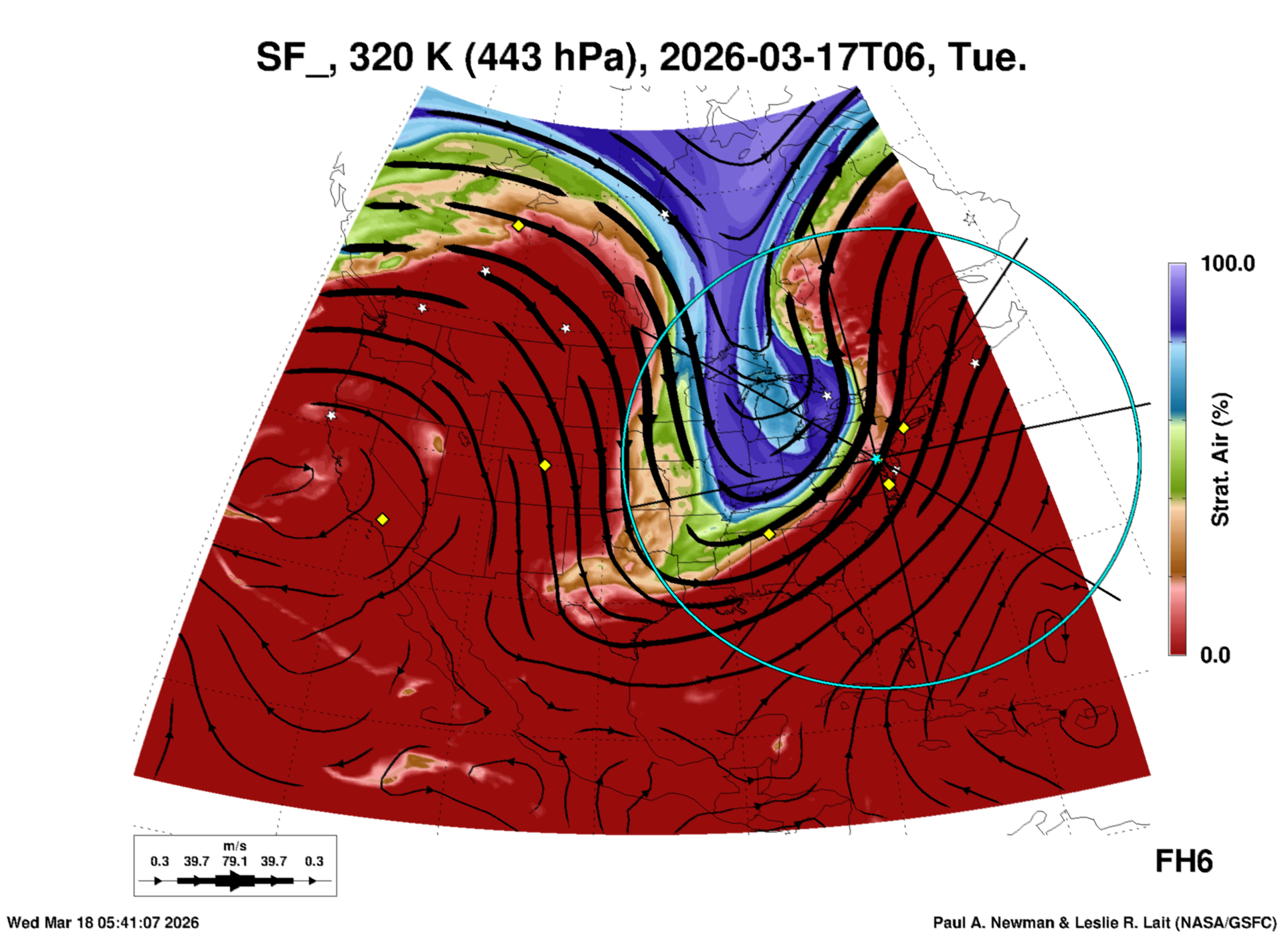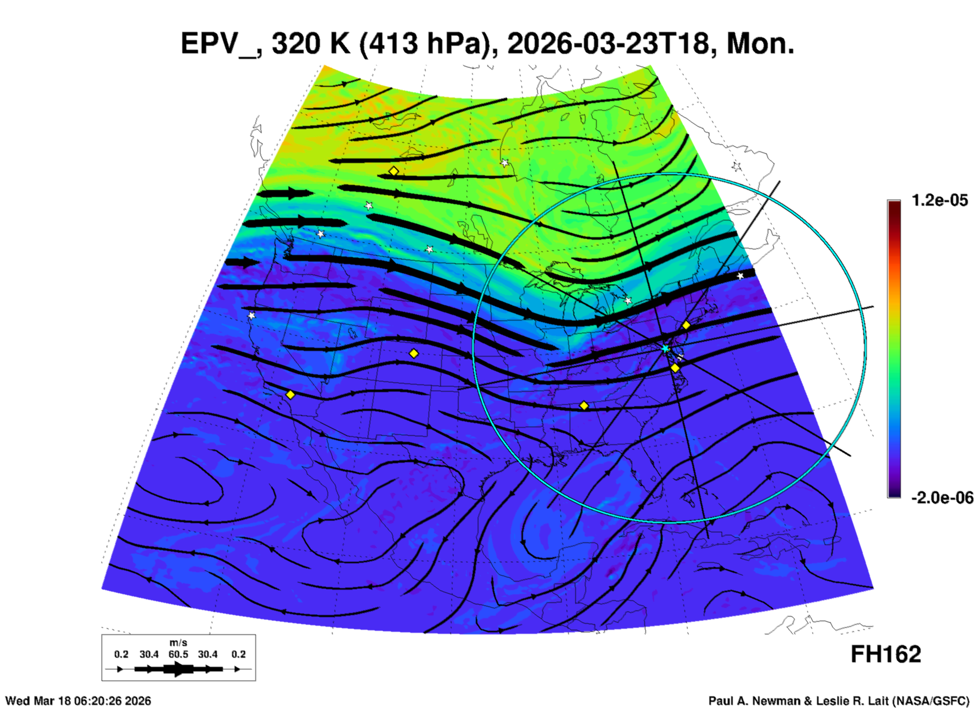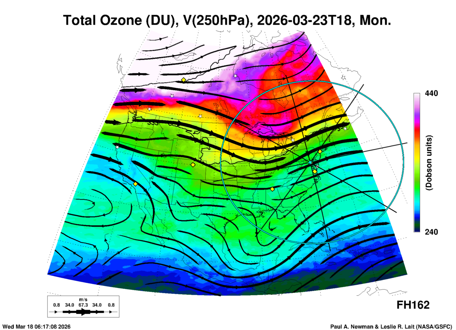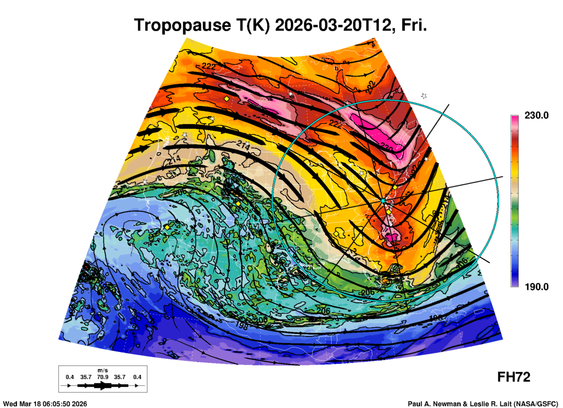 Most of these plots show a color-coded image background of some physical quantity which is labelled in the leftmost column above. A color bar scale on the right of the image shows how the quantity values map to the colors. Superimposed on the image is a depiction of the horizontal flow field as blue streamlines with arrows marking the direction of the flow. The thickness of each streamline indicates the wind speed, according to the legend at the bottow left. Where the physical quantity is a vertically cumulative variable that does not describe a single vertical level (e.g. CAPE), the pressure level indicated in the title is that of the flow field. Continental outlines are shown as thin white or yellow lines.