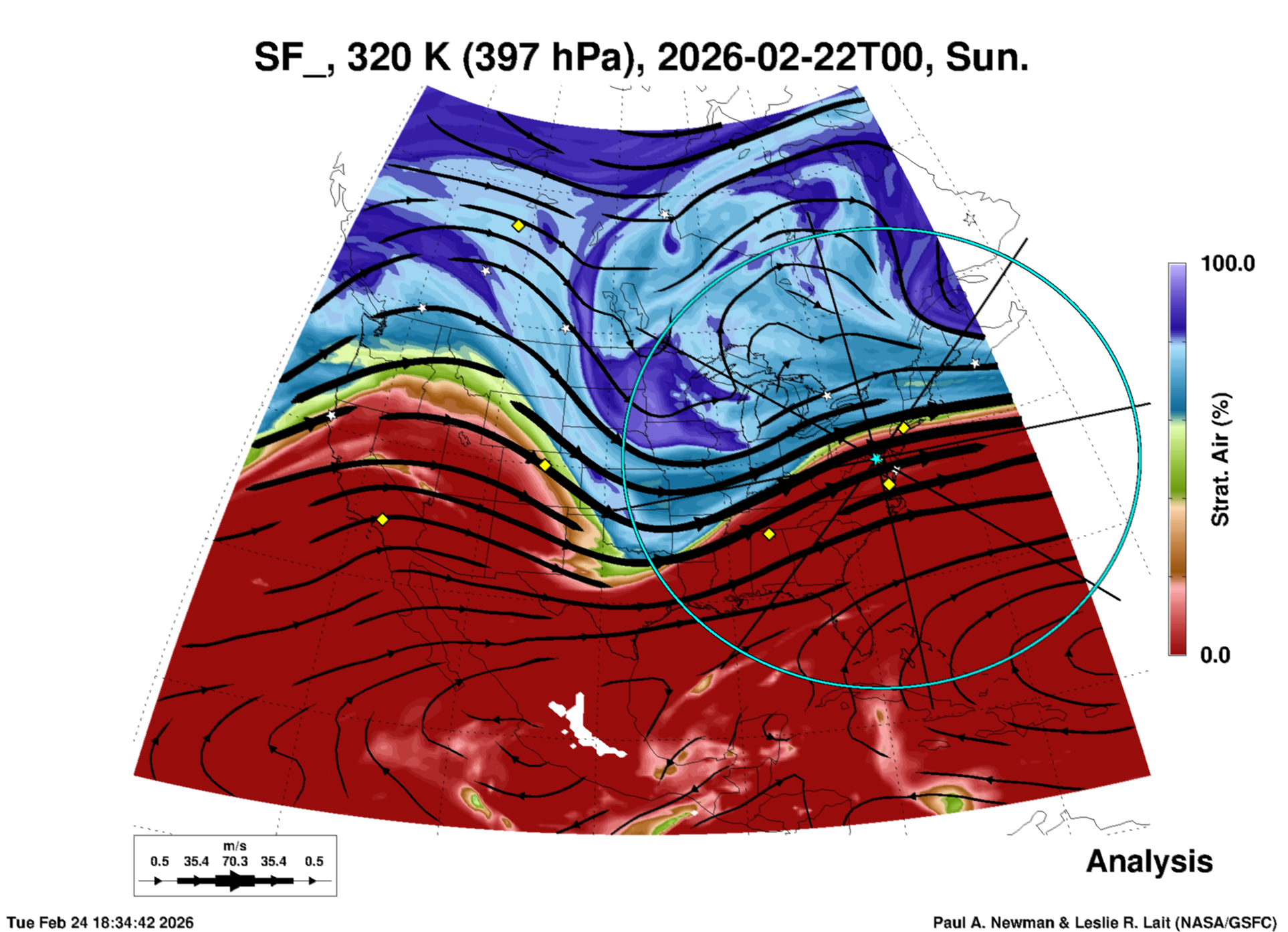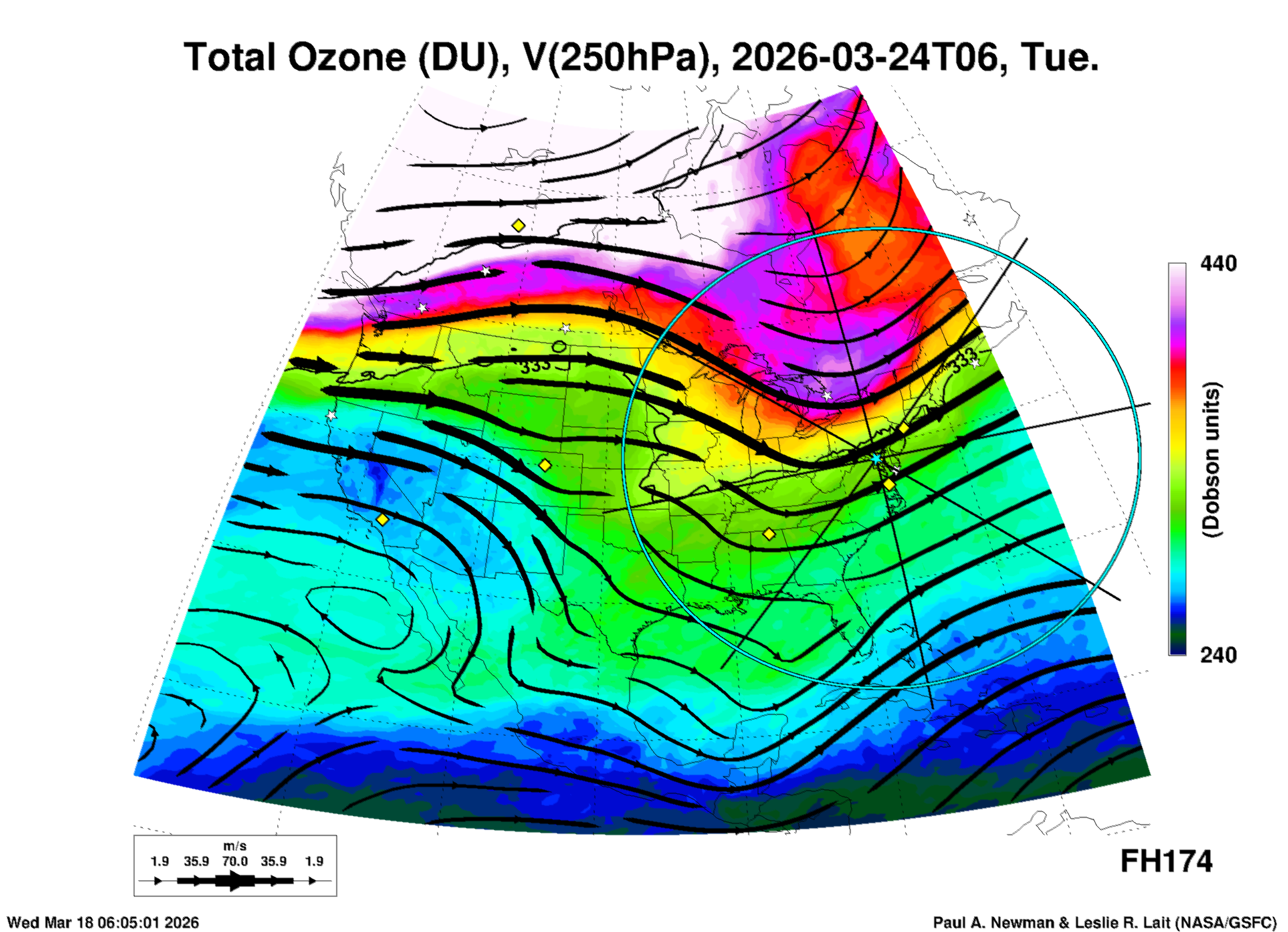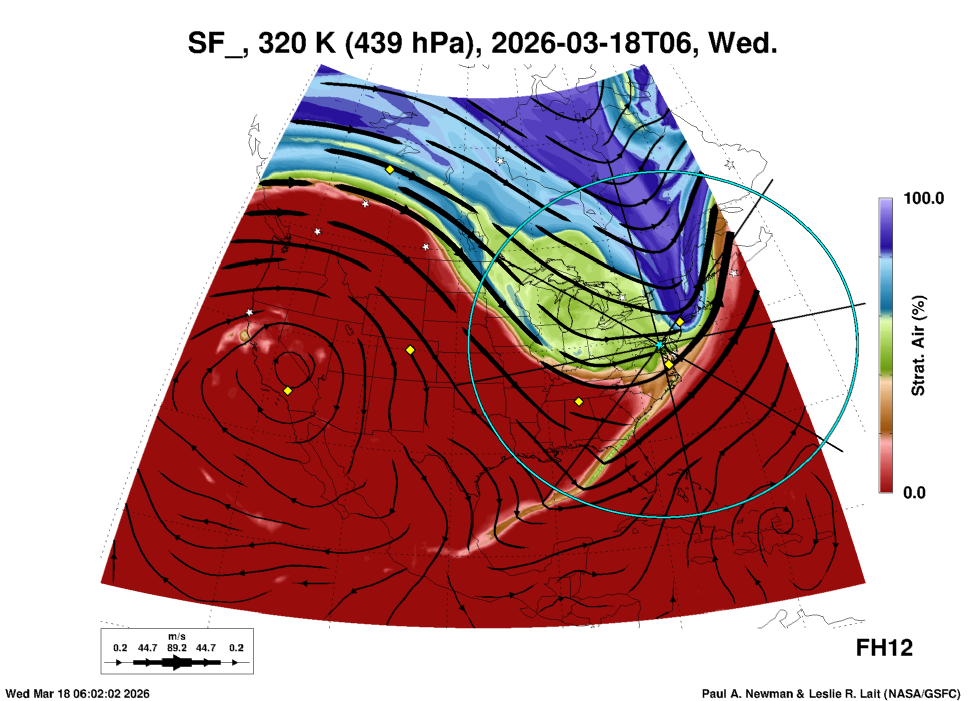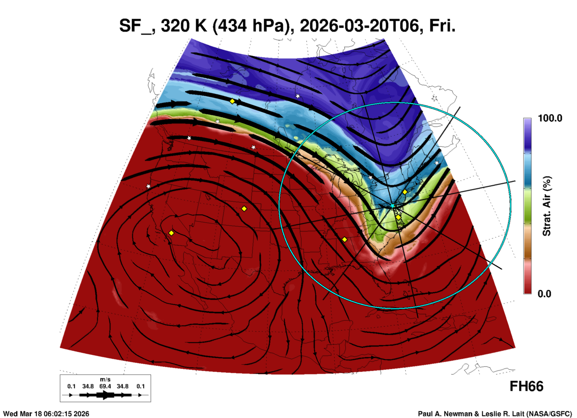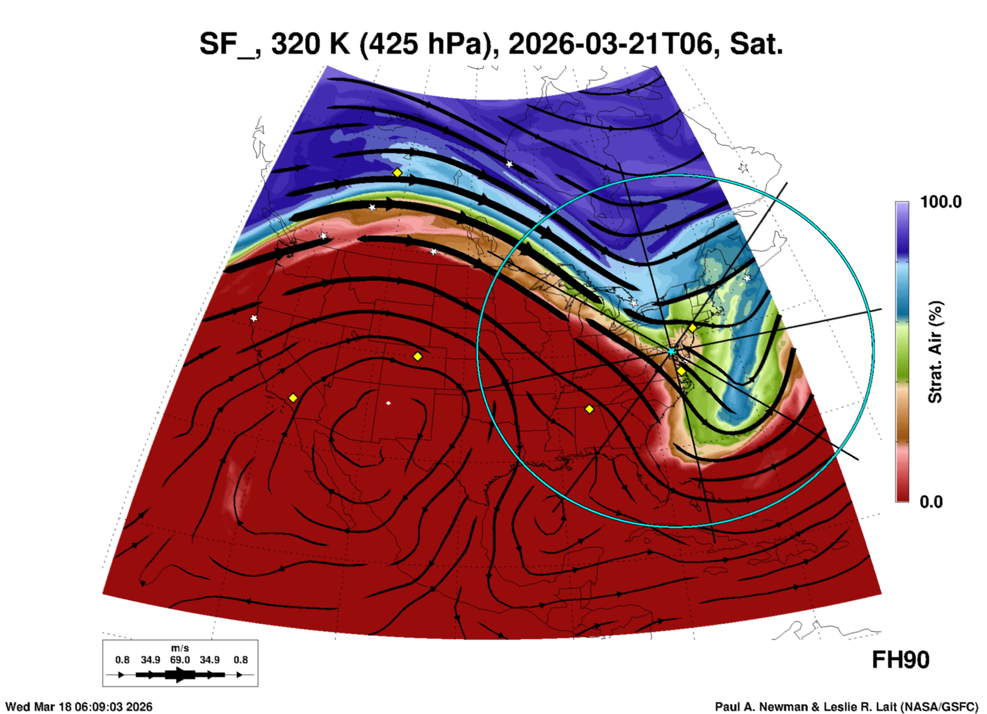 Most of these plots show a color-coded image background of some physical quantity which is labelled in the leftmost column above. A color bar scale on the right of the image shows how the quantity values map to the colors. Superimposed on the image is a depiction of the horizontal flow field as blue streamlines with arrows marking the direction of the flow. The thickness of each streamline indicates the wind speed, according to the legend at the bottow left. Where the physical quantity is a vertically cumulative variable that does not describe a single vertical level (e.g. CAPE), the pressure level indicated in the title is that of the flow field. Continental outlines are shown as thin white or yellow lines.