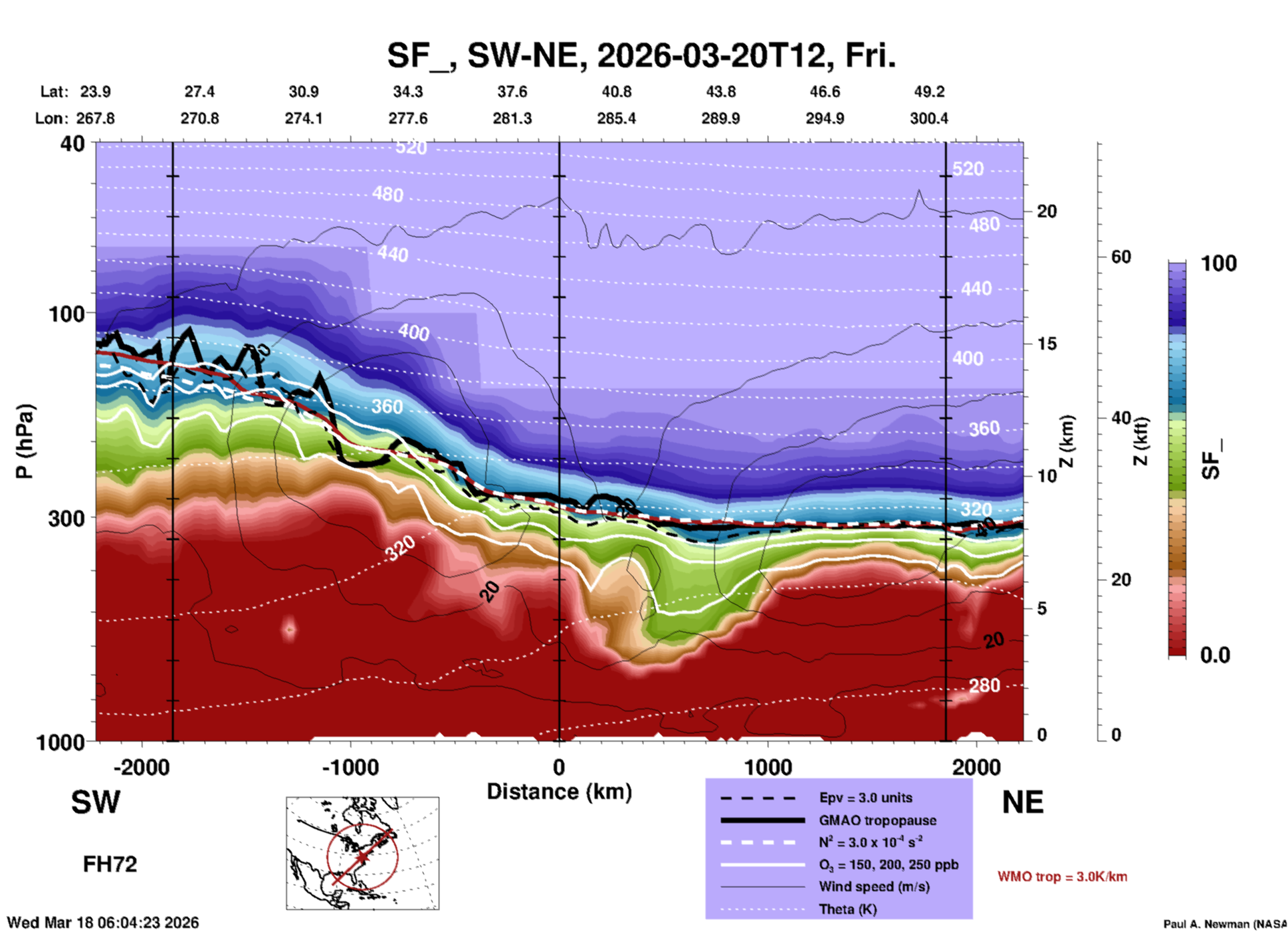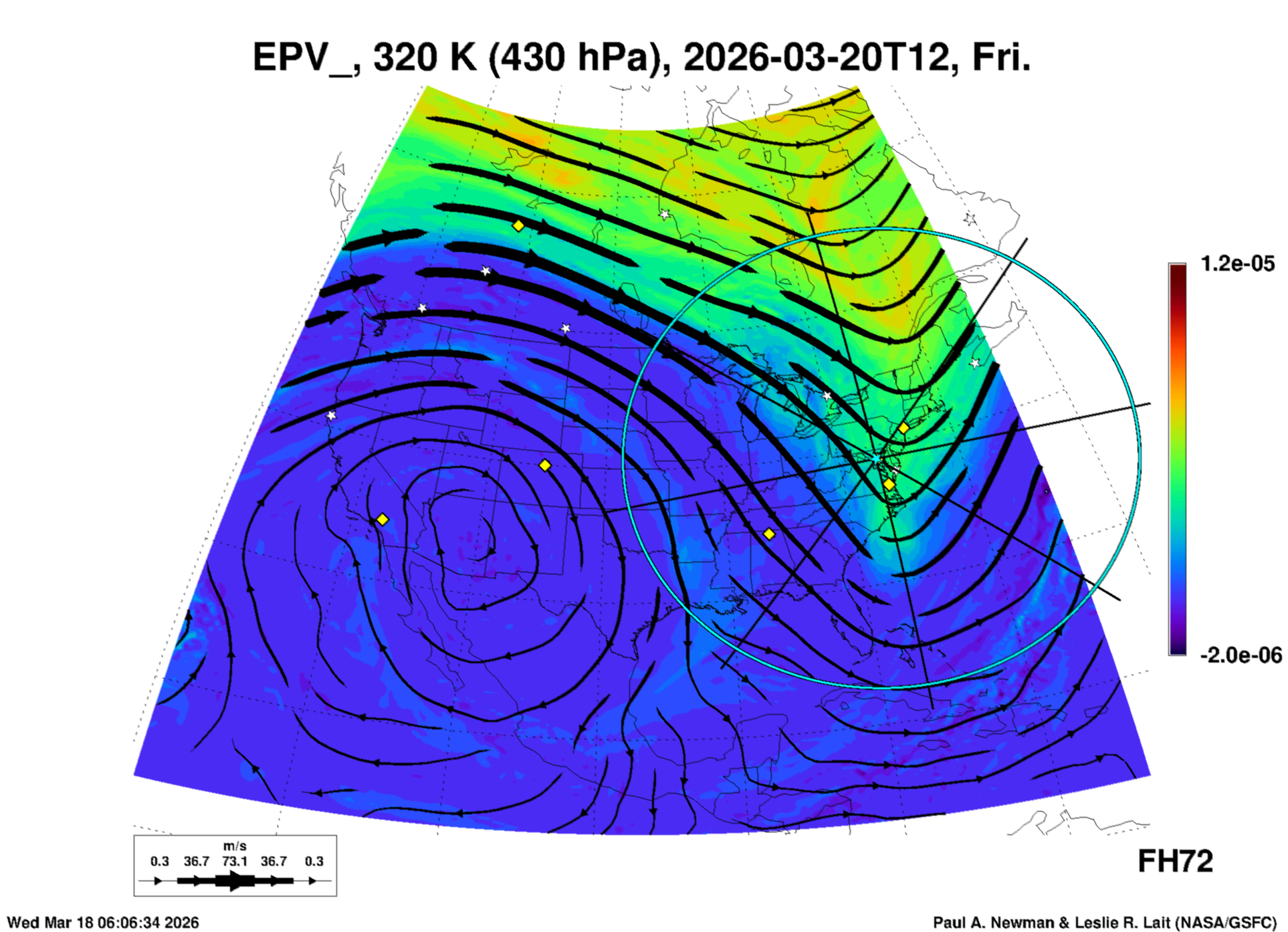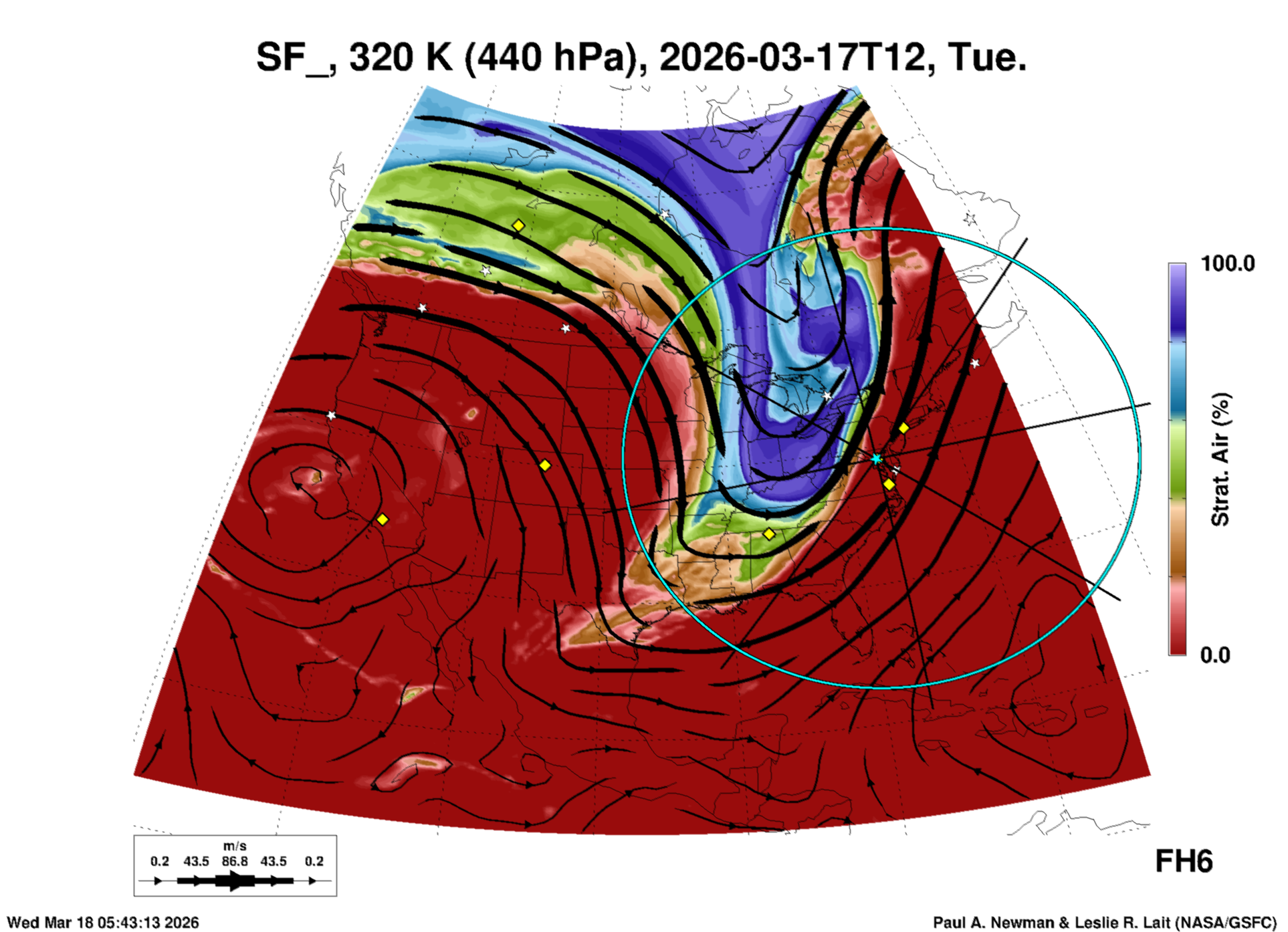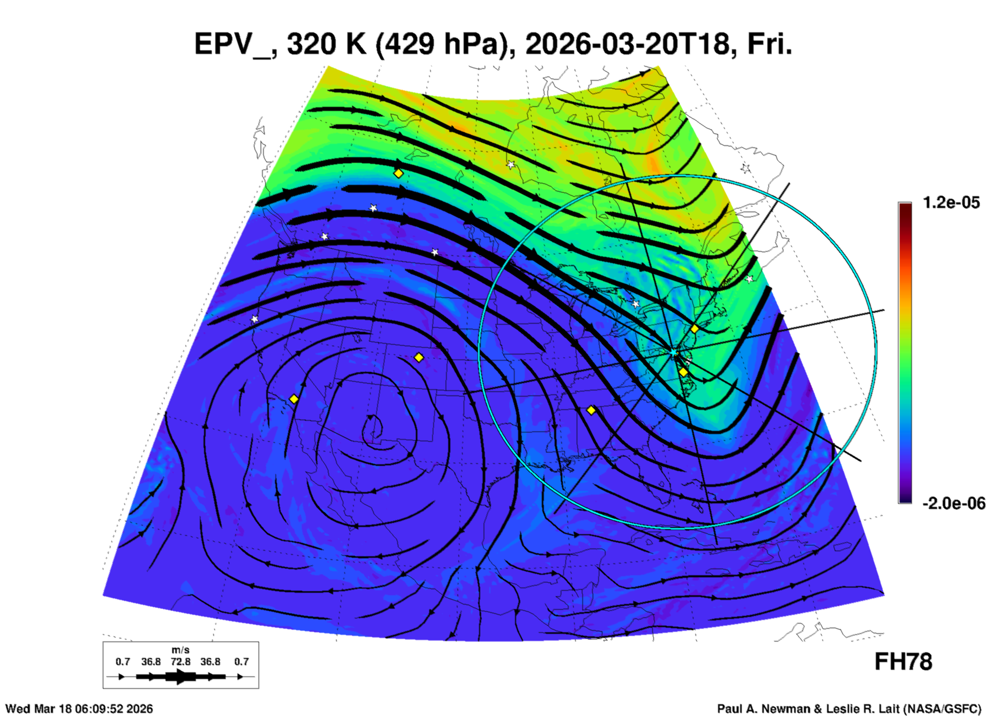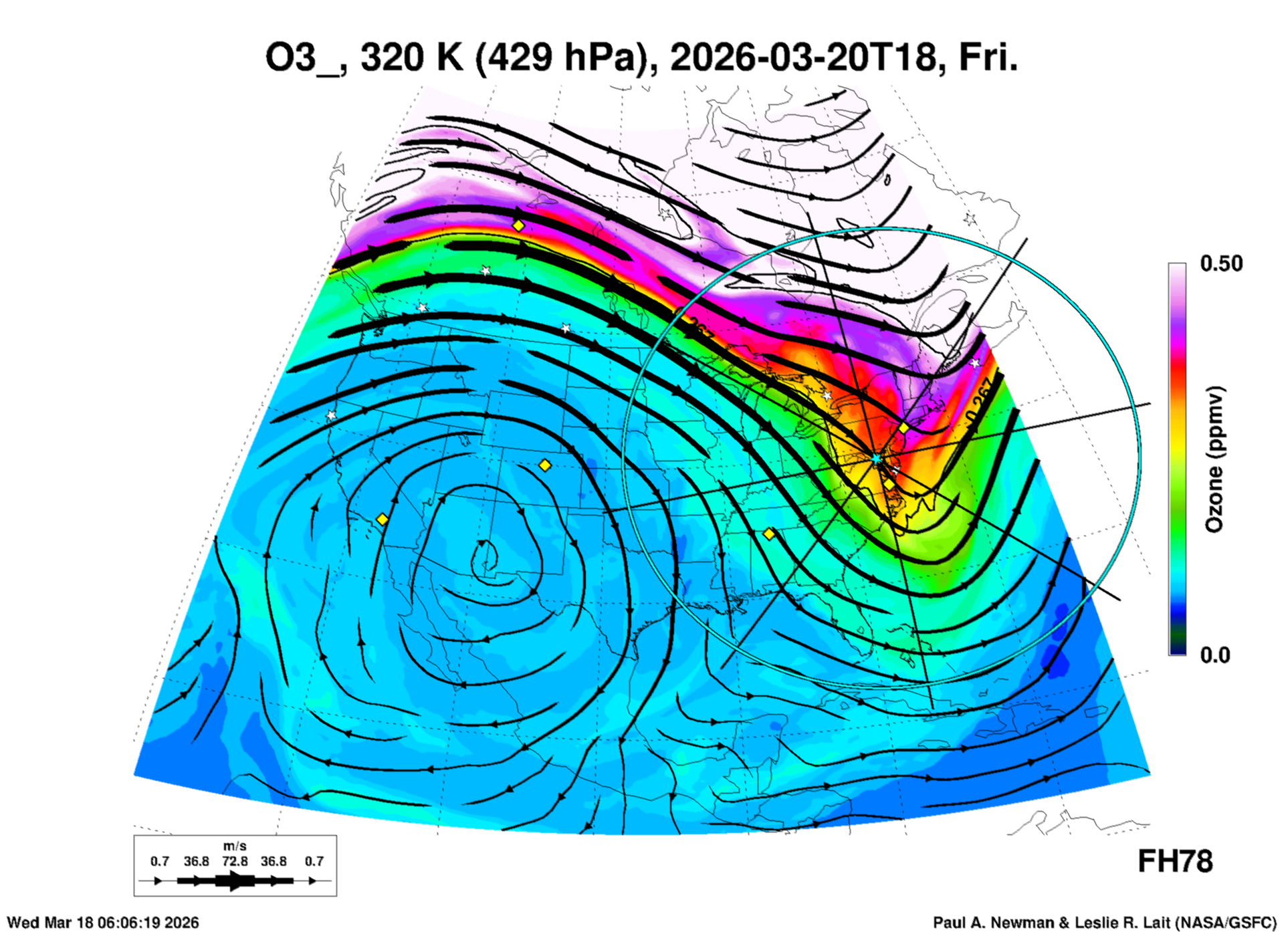 Most of these plots show a color-coded image background of some physical quantity which is labelled in the leftmost column above. A color bar scale on the right of the image shows how the quantity values map to the colors. Superimposed on the image is a depiction of the horizontal flow field as blue streamlines with arrows marking the direction of the flow. The thickness of each streamline indicates the wind speed, according to the legend at the bottow left. Where the physical quantity is a vertically cumulative variable that does not describe a single vertical level (e.g. CAPE), the pressure level indicated in the title is that of the flow field. Continental outlines are shown as thin white or yellow lines.