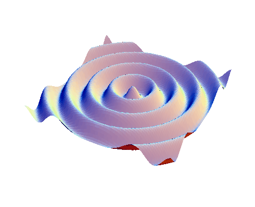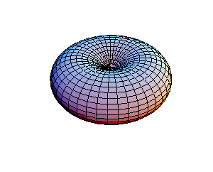 Amplitude of Rayleigh scattering by an atom or molecule (at the center of the "doughnut"). The electromagnetic waves are coming in from the left, and are polarized with their electric fields in the vertical direction. There is no scattering into the vertical direction. Choose a point on this surface, and draw a line from that point to the center. The distance between the points is proportional to the intensity of the radiation scattered in the direction of the chosen point. The intensity is largest in any direction in the plane perpendicular to the plane of polarization.