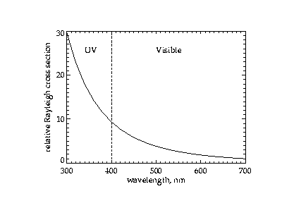 The Rayleigh scattering cross section as a function of wavelength, through the UVA, UVB, and visible regions of the spectrum. The greater the cross section, the more efficient the molecules are at scattering the light. The scattering cross section is about 9 times as great at the blue-violet end of the visible spectrum than at the red end. Over the UV region, the scattering cross section increases by a futher factor of about 3.
